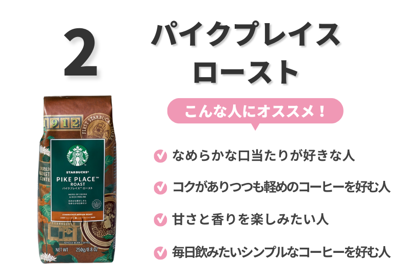 ココアやプラリネのような風味、なめらかな舌触りとチョコレートのようなコクが特徴で、バランスの取れた味わいです。1号店の名前を冠したこのコーヒーは、スターバックスの歴史と伝統を感じさせてくれます。
