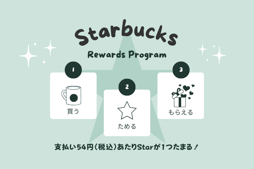 スターバックス リワードとは、公式アプリや登録済みスターバックス カードでお買い物をすると、Star というポイントが貯まり、貯まったStarをいろいろなごほうびに交換できる、スタバの会員ステータス リワードプログラムです。