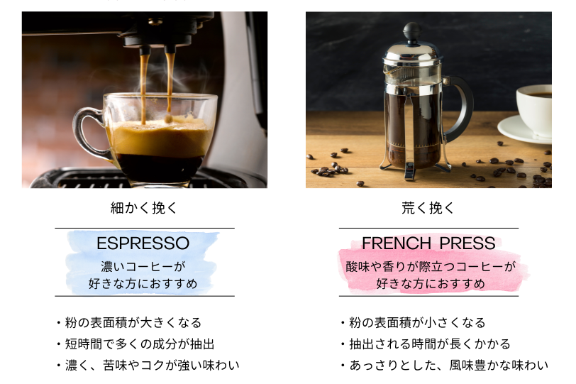 コーヒー豆の挽き方が大切なのは、味わいに大きく影響を与えるからです。挽き方によってコーヒーの風味が変わり、同じ豆でも違う味を楽しむことができるんですよ。