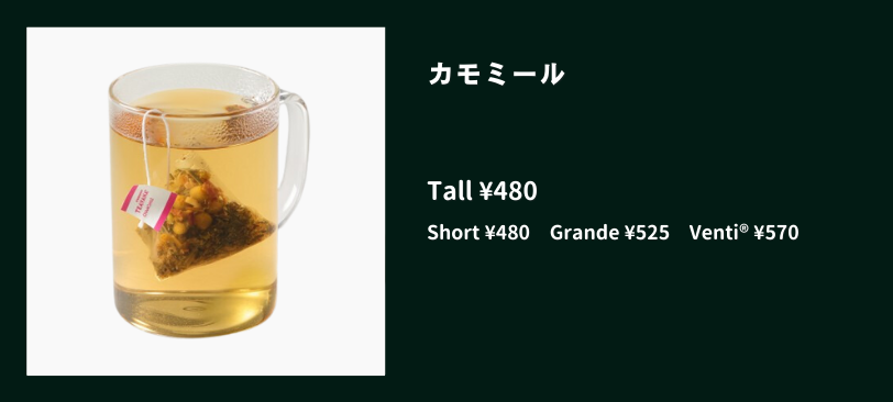 | スタバの例 | ディカフェ ラテ、 ディカフェ アメリカーノ | スタバではデカフェと 同じ意味で使われている | カモミールティー、 バニラ クリーム フラペチーノ |