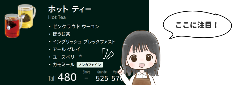 メニューに「ノンカフェイン」のマークが記載されています。