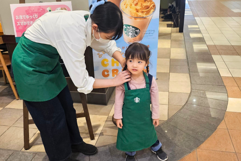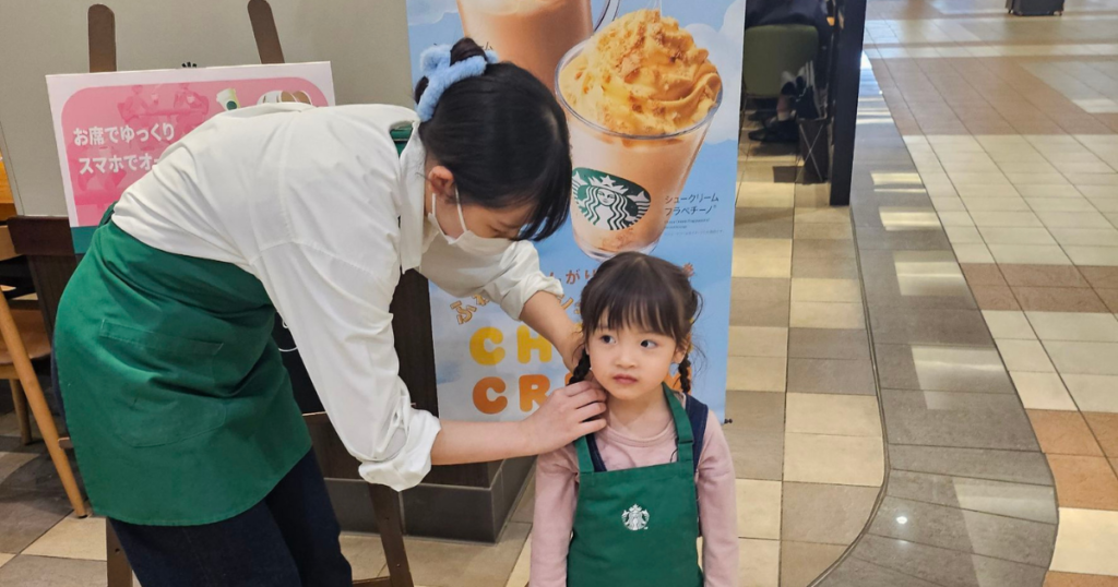子どもがスタバの象徴であるグリーンエプロンを着て、バリスタ体験ができる特別イベント!